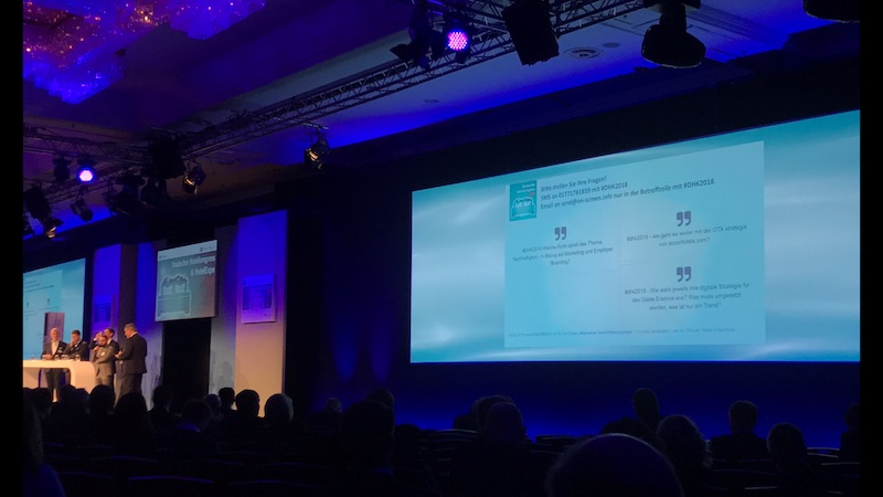 Aufgabe: Zu den Vorträgen des deutschen Hotelkongress soll das Publikum die Möglichkeit haben Fragen per SMS & Email zu schicken. Die interessantesten Fragen sollen direkt auf der Leinwand angezeigt werden.