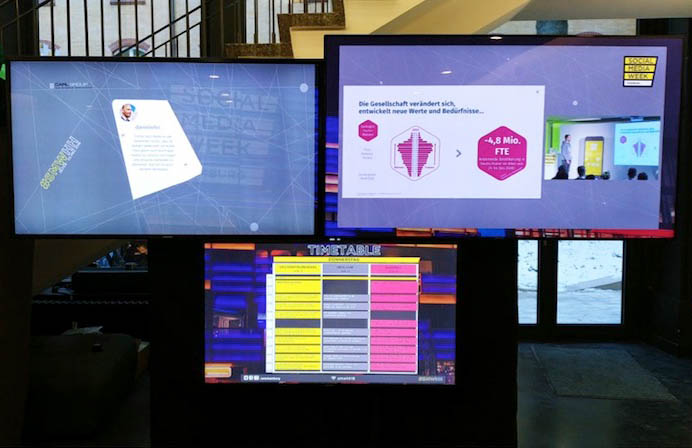 Aufgabe: Während der Social Media Week sollen Posts auf diversen Social Walls auf dem Veranstaltungsgelände gezeigt werden. Während der Vorträge soll das Publikum durchgehend die Möglichkeit haben Fragen zu twittern. Die interessantesten Fragen sollen direkt auf den Monitoren im Veranstaltungsraum angezeigt werden.