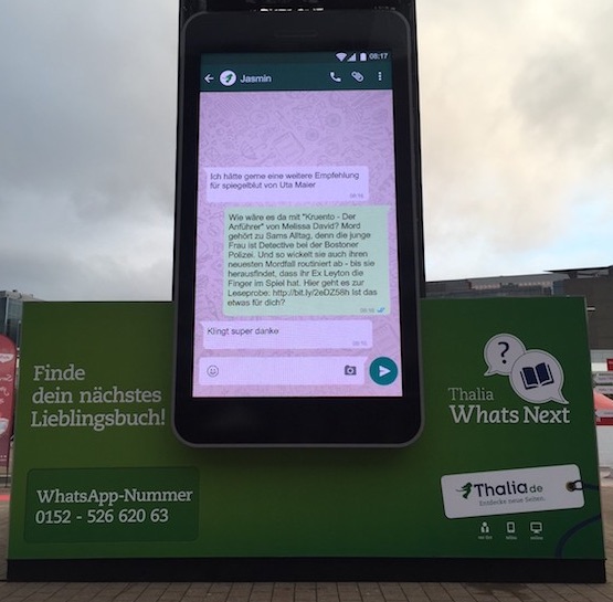 Aufgabe: Beim interaktiven Messeauftritt von Thalia auf der Frankfurter Buchmesse sollen die Messebesucher die Möglichkeit haben an eine WhatsApp Nummer Nachrichten zu senden und nach Empfehlungen zu fragen. Die gesendeten Fragen und die Antworten der Thalia Redaktion sollen auf einem riesigen iPhone vor der Messehalle visualisiert werden.