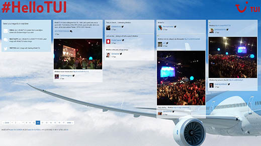 Einsatz sendONSCREEN®: Alle eingegangen Nachrichten wurden redaktionell im sendONSCREEN Redaktionssystem gefiltert. Visualisierung auf der Webseite von TUI für insgesamt 3 Monate.