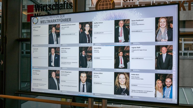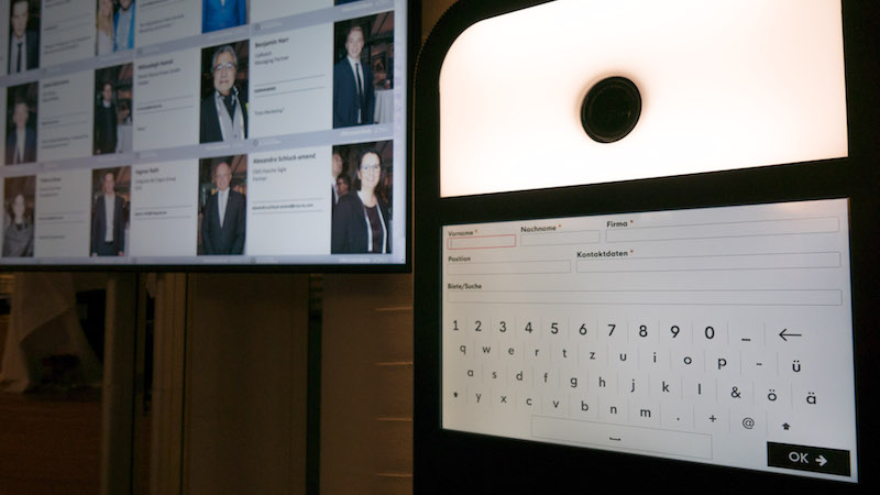 Einsatz sendONSCREEN®: Auf der digitalen Carl-UpReach-Fotobox konnten die Kongressteilnehmer ihre persönlichen Kontaktdaten eingeben und ein Foto von sich machen lassen. Diese digitalen Visitenkarten wurden dann durch sendONSCREEN auf diversen Monitoren visualisiert und sorgten so für eine digitale Vernetzung der Teilnehmer. Zudem wurden die Bilder über sendONSCREEN ins Web und die Veranstaltungsapp integriert.